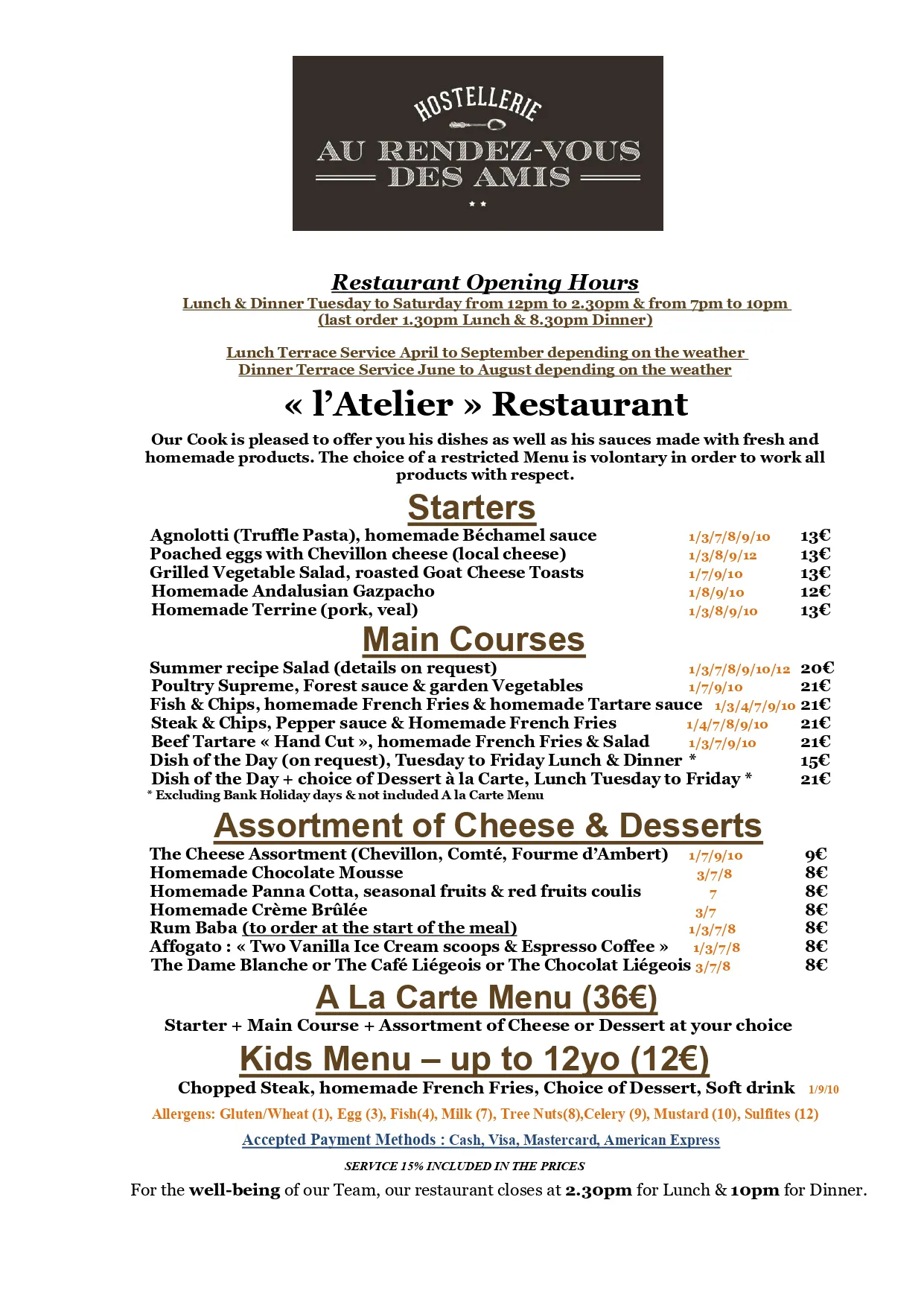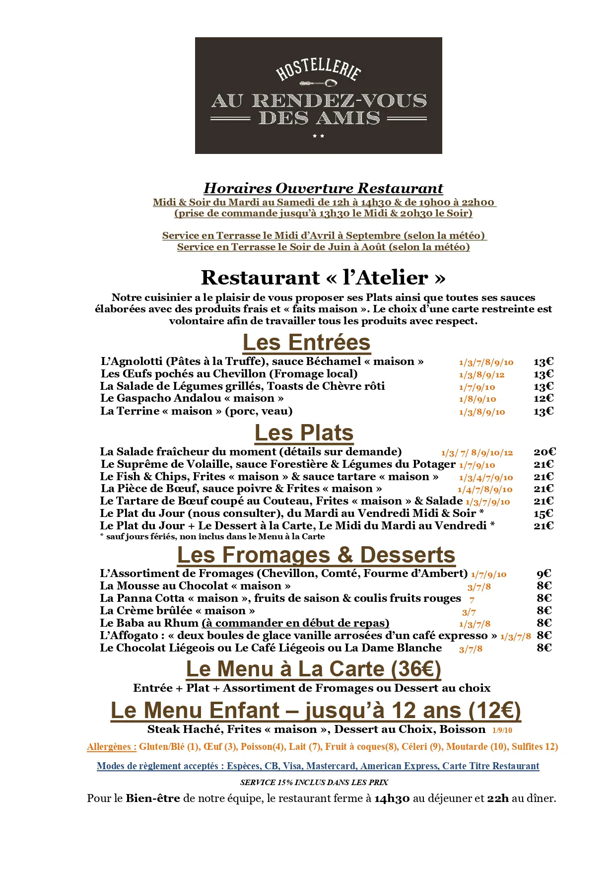 À l'Hostellerie Au Rendez-vous des Amis, nous prenons très au sérieux les restrictions alimentaires (allergies). Faites-nous part de vos exigences particulières et nous ferons de notre mieux pour y répondre.