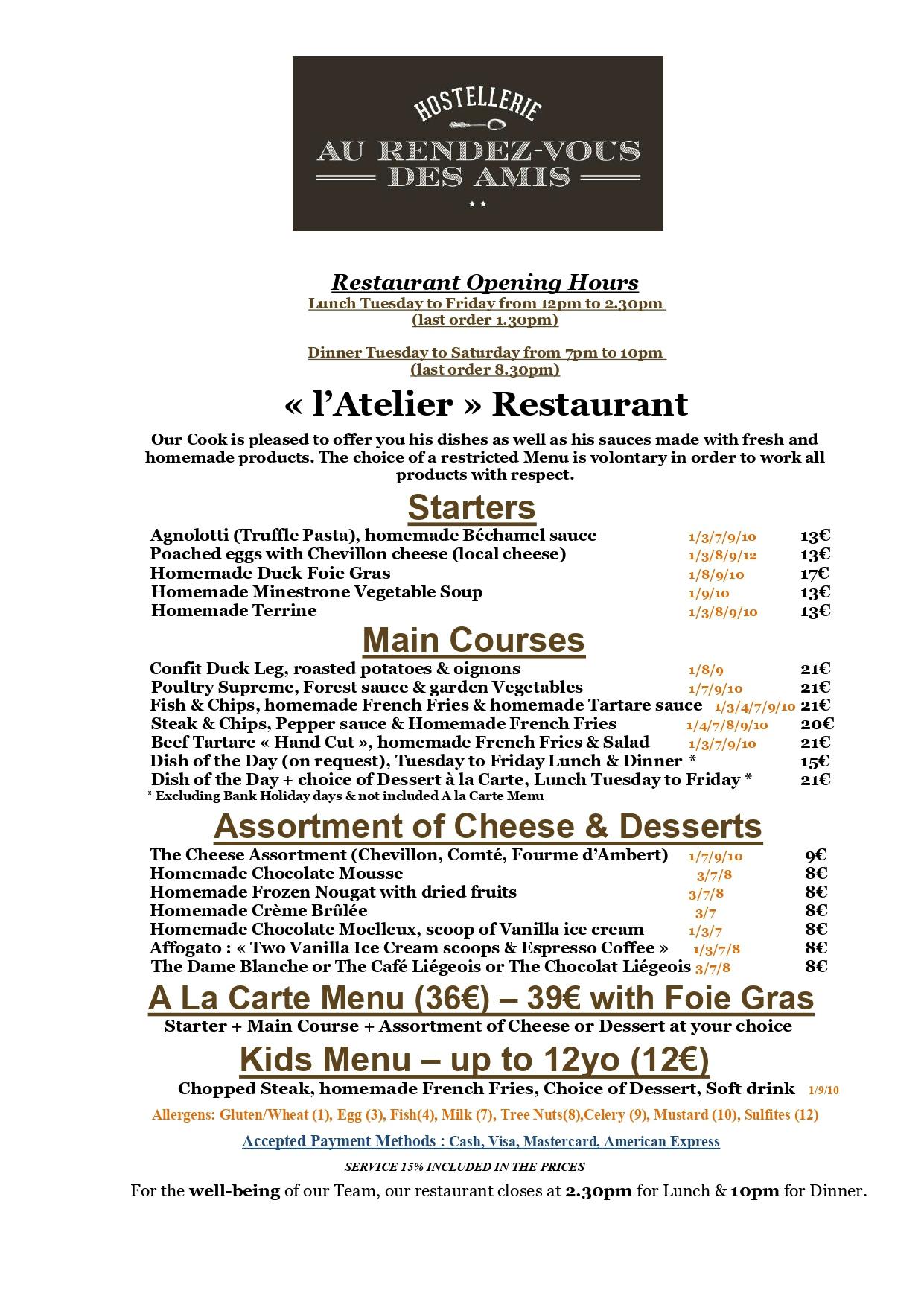 Bij l'Hostellerie Au Rendez-vous des Amis nemen we dieetbeperkingen (allergieën) zeer serieus. Laat het ons weten als u speciale wensen heeft en wij zullen ons uiterste best doen om hieraan tegemoet te komen.